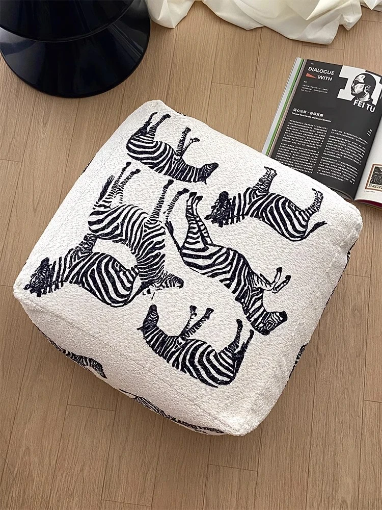おしゃれな白いゼブラ柄の小さなスツール!家庭用の低い椅子として、リビングやバルコニーにぴったり。クッション付きで快適、取り外し可能なカバーでお手入れも簡単。お部屋のアクセントに最適なアイテムです!