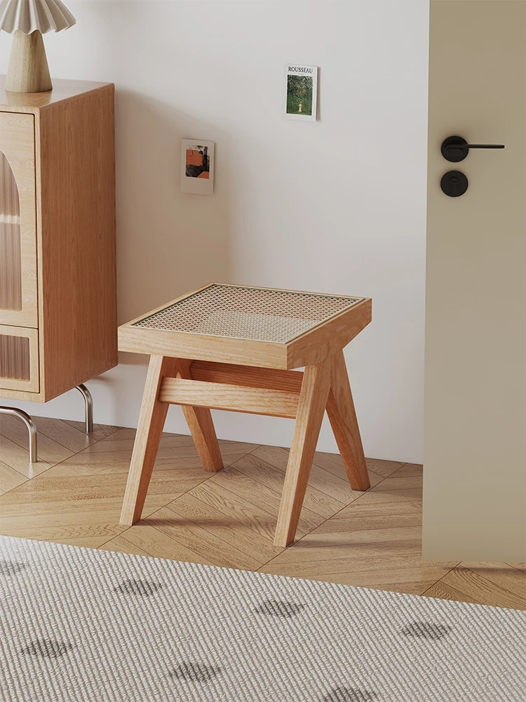 無垢材のラタン編みスツール - リビングルームに最適な家用スツール!シャンディガール風の長椅子、ヴィンテージスタイルの民宿やカフェにぴったりな人気のティーテーブルスツール!